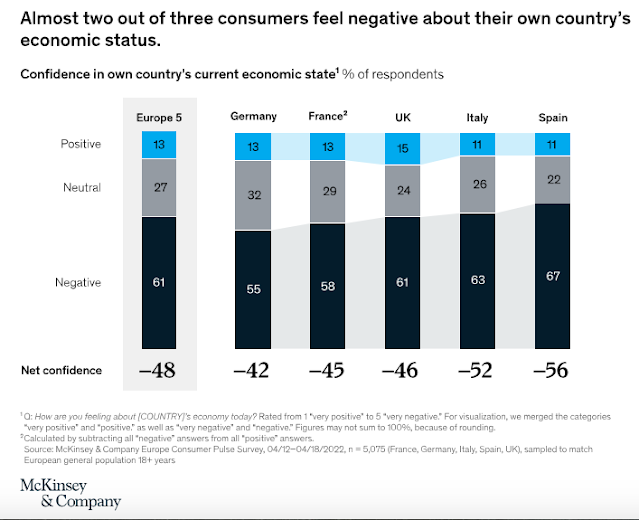 Si bien existen pequeñas diferencias, estas tendencias se mantienen en Francia, Alemania, Italia, España y el Reino Unido. Se destacan en los siguientes nueve gráficos de nuestra última encuesta European Consumer Pulse, realizada del 12 al 18 de abril de 2022. Esta encuesta aprovechó las opiniones de 1000 encuestados en cada uno de los países mencionados.