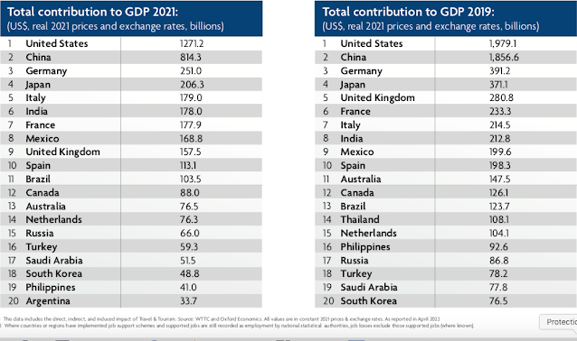 - En 2019, el sector de viajes y turismo aportó un 10,3 % al PIB mundial; una proporción que disminuyó al 5,3% en 2020 debido a las continuas restricciones a la movilidad. En 2021, la participación aumentó al 6,1%.