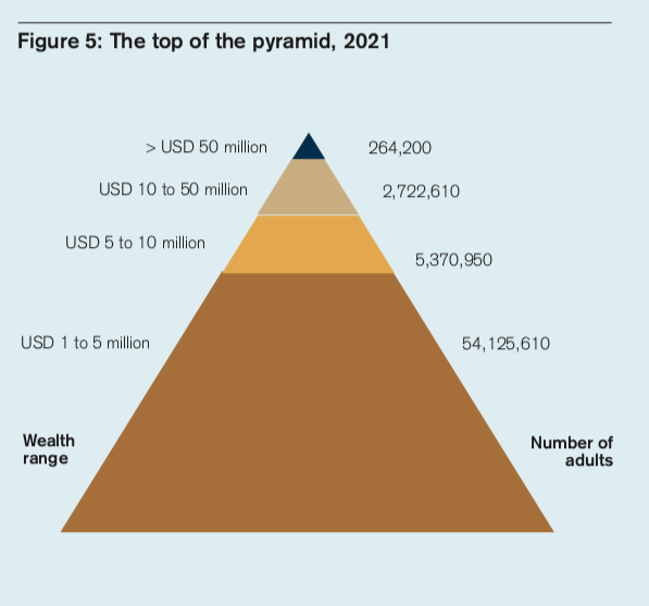 En la cima de la pirámide de riqueza, Estados Unidos sigue ocupando el primer lugar con más de 140.000 personas con un patrimonio neto ultra alto (con una riqueza superior a 50 millones de dólares), seguido de China con 32.710 personas. A nivel mundial, estimamos que había 62,5 millones de millonarios a finales de 2021, 5,2 millones más que el año anterior.