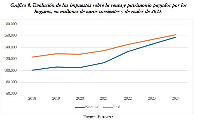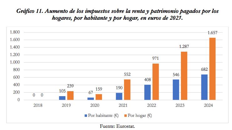Los impuestos directos pagados por las familias crecen +56,3% nominal y +31,1% real desde 2018. Cada hogar paga hoy 1.657 € más al año (euros constantes). El esfuerzo fiscal directo sube del 13,6% al 15,9% de la renta bruta disponible.