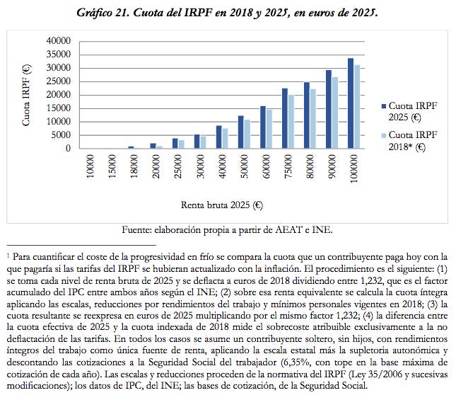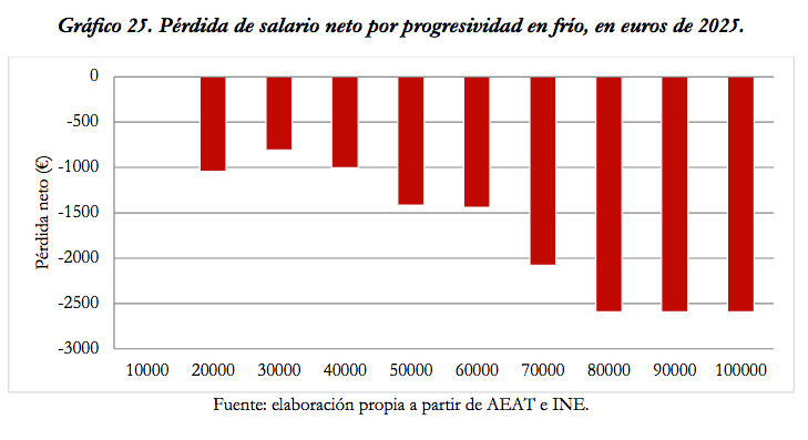 Tras los 65 años se paga aún el 31,3% de toda la carga fiscal vital, principalmente vía impuestos sobre el capital y el consumo. IRPF mal diseñado: castiga a la clase media El tipo del 45% se aplica desde 60.000 € (2,1× salario medio), muy por debajo de Alemania o Francia. Entre 20.000 y 60.000 €, la cuota se multiplica por 7,5; entre 100.000 y 200.000 €, el tipo efectivo apenas sube 6 puntos. La “progresividad en frío” es regresiva Un trabajador de 18.000 € ha triplicado su IRPF desde 2018; uno de 75.000 € solo lo aumenta un 12%. La pérdida de salario neto real alcanza el 5,9% en rentas bajas (más de 1.000 € anuales).