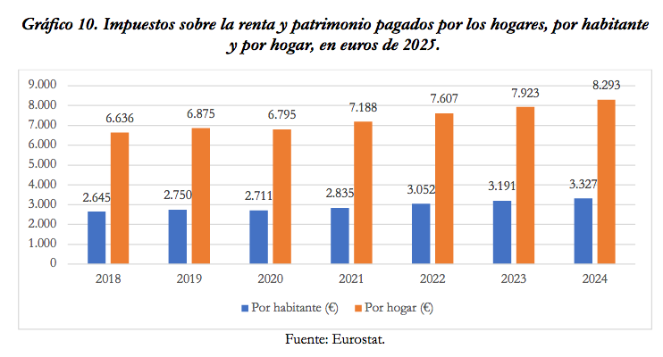 En términos reales, el impuesto directo medio por habitante sube un 25,8%. El mayor salto se produce entre 2021 y 2022, coincidiendo con la inflación no deflactada.