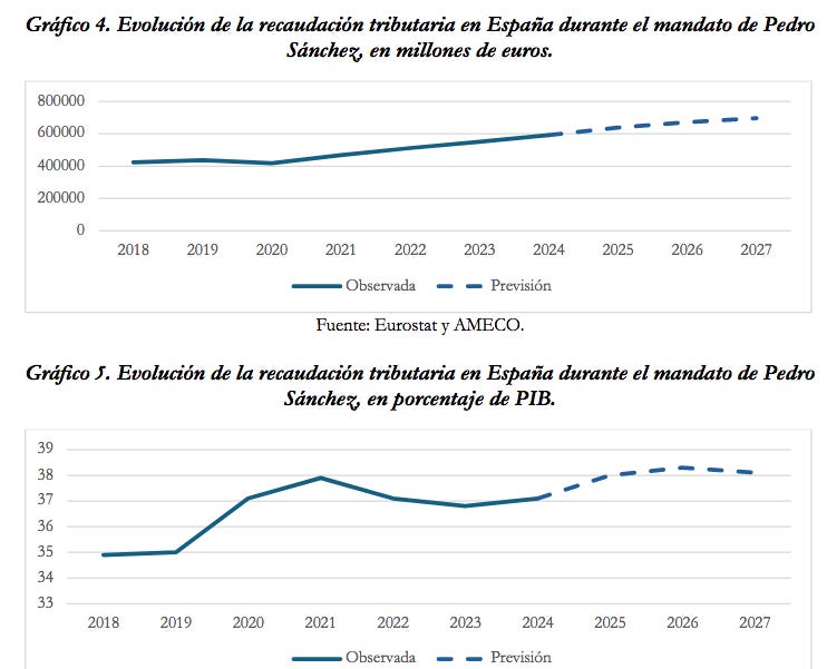 Desde 2018, los ingresos tributarios han crecido en 168.166 M€ (+39,7%), y podrían alcanzar +248.000 M€ en 2026 (+58,5%). La presión fiscal habría subido 3,4 puntos de PIB en ocho años, sin precedentes históricos.