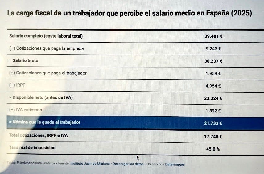 Acaba de hacerse público el mas reciente informe del Instituto Juan de Mariana, y las noticias no son nada buenas para quienes pagan impuestos en España. Dicho informe detalla por ejemplo como el Estado en promedio, recibe el 45% del salario del trabajador a través de cotizaciones, IRPF e IVA.