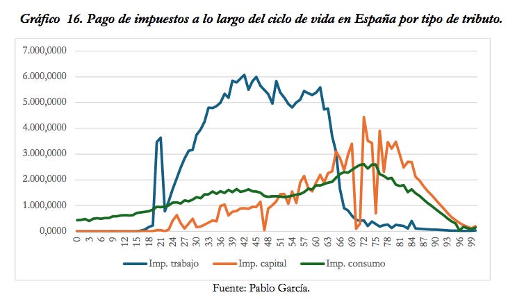 Según las Cuentas Nacionales de Transferencia, un individuo medio paga 460.600 € a lo largo de su vida: – Trabajo: 47,3% – Consumo: 28,1% – Capital: 24,0% Equivale a 16-30 años de salario, según referencia (medio, mediano o modal).