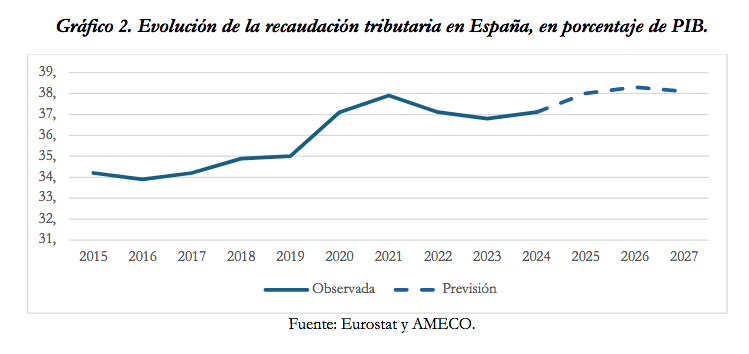Con 591.679 M€ en 2024 (37,1% del PIB), el nivel más alto jamás registrado. En 2015 era del 34,2%. Las previsiones de la Comisión Europea elevan la presión fiscal al 38,3% del PIB en 2026, con 671.500 M€ recaudados.