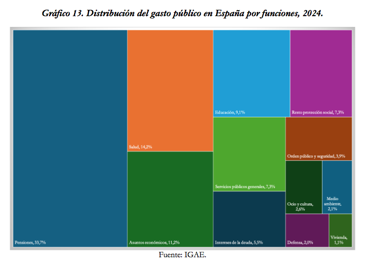 El gasto público asciende a 725.006 M€ (2024). – Pensiones: 33,7% – Sanidad: 14,2% – Asuntos económicos (subvenciones, empleo, infraestructuras): 11,2% Entre 2018-2024, el gasto crece +221.813 M€, y 1 de cada 3 euros nuevos va a pensiones.
